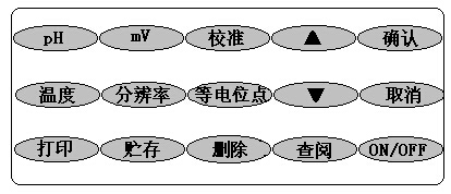 儀器共有15個操作鍵,分別為:ON/OFF、pH、mV、溫度、校準、等電位點、分辨率、打印、貯存、刪除、查閱、▲、▼、確認和取消。