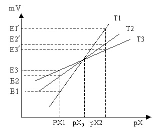 如果標準溶液和被測溶液的溫度不同時,就必須進行等電位補償,否則會帶來較大的測量誤差。測試離子選擇電極等電位點的方法是取兩個(或兩個以上)不同的標準溶液(pX1,pX2)用mV擋測量它們在不同溫度下的電位值(一般做三個以上不同的溫度)。從一個溫度變為另一個溫度測量時,一定要待電極達到溫度平衡狀態后,才能進行測量,然后以不同溫度下測得的數據作圖,(圖3)中直線的交點就是測得的等電位點,對應橫座標軸上的值就是等電位pX值。