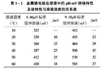 金屬銻電極pH-mV在堿性溶液中斜率不同,即轉換系數線性差。pH-mV轉換溫度系數不是常數,且呈非線性關系,表1-1給出了金屬銻電極在3種標準緩沖溶液中的pH-mV轉換特性及該特性與溶液溫度的關系(該數據范圍主要是針對油田污水而列出的)。