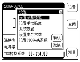 用戶直接在相應的測量參數、測量模式以及測量條件上相應區域按動,儀器即反向顯示當前的操作選項,表示已經選中,再按一次即可完成選擇,比如要將測量參數修改為TDS,則在測量參數下“2.TDS”區域按一下,儀器反向顯示“2.TDS ”,再按一次,則顯示為“2.TDS √”表示選擇成功,同時下面也有同步提示。