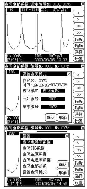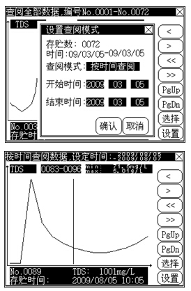 儀器顯示總的存貯數以及相應的存貯時間范圍。用戶按照實際需要可以選擇相應的查閱模式:查閱全部數據、按編號查閱、按時間查閱等。