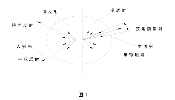 如圖1所示,光線射到一透明或半透明物體上時,部分產生定向反射,部份產生漫反射,進入樣品合部份被吸收,部分被透過,出射樣品的光中,主透射部份按折射定律前進,部份產生半球透射,其前進方向是散亂的。