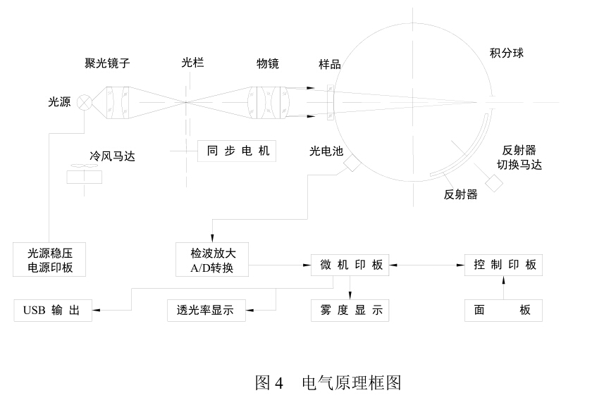 由光源1(鹵鎢燈)發出的光經聚光鏡2會聚,通過光欄3,經遮光式調制器4射到物鏡5 上,物鏡 5 射出一束平行光束,其光線偏離角不大于 3o,并將光欄 3 成像在出射窗 10上,出射窗對入射窗口中心的張角為 8 o,光斑邊緣與出射擊窗形成 1.3 o的環帶。積分球 7 內裝有一可擺動的標準反射器 9,當測定透光率及總透射光時,標準反射器被控在位,擋住出射窗;當測散射光時,從出窗處讓開。