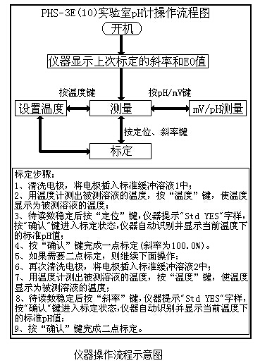 在測量狀態(tài)下,按“mV/pH”鍵可以切換顯示電位以及pH值;按“溫度”鍵設(shè)置當(dāng)前的溫度值;按“定位”或“斜率”鍵標(biāo)定電極斜率,簡要的操作流程見下圖: