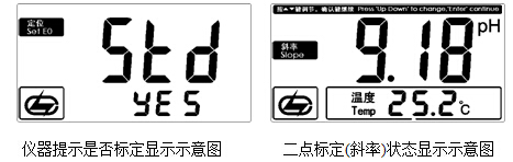 c) 同理,再次清洗電極并插入標(biāo)準(zhǔn)緩沖溶液2中(pH=9.18pH的標(biāo)準(zhǔn)緩沖溶液中);如儀器沒接溫度電極則可用溫度計(jì)測出溶液的溫度值(如25.2℃),并設(shè)置溫度值;稍后,待讀數(shù)穩(wěn)定后,按“斜率”鍵,再確認(rèn),儀器自動(dòng)識(shí)別當(dāng)前標(biāo)液并顯示當(dāng)前溫度下的標(biāo)準(zhǔn)pH值(如9.18pH),顯示如圖: