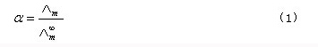 在弱電解質溶液中,只有已經電離的部分才能承擔傳遞電量的任務。在無限稀釋的溶液中可以認為弱電解質已全部電離,此時溶液的摩爾電導率為,可以用離子的極限摩爾電導率相加而得。而一定濃度下電解質的摩爾電導率∧m與無限稀釋的溶液的摩爾電導率是有區別的,這由兩個因素造成,一是電解質的不完全離解,二是離子間存在相互作用力。二者之間有如下近似關系: