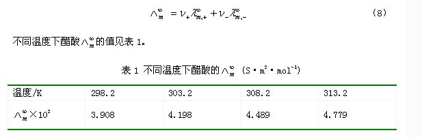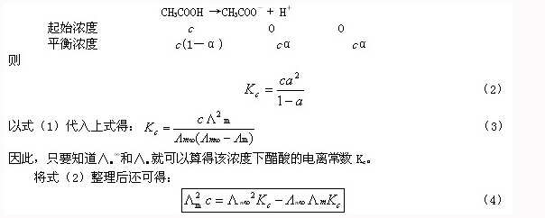 當電導池常數Kcell確定后,就可用該電導池測定某一濃度c的醋酸溶液的電導,再用(7)式算出κ,將c、κ值代入(5)式,可算得該濃度下醋酸溶液的摩爾電導率。