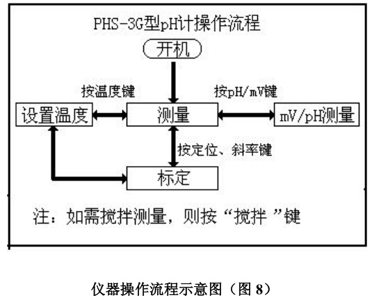 在測量狀態下,按“mV/pH”鍵可以切換顯示電位或 pH 值;按“溫度”鍵設置當前的溫度值;按“定位”或“斜率”鍵標定電極斜率,簡要的操作流程見下圖: