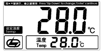如果用戶需要設置溫度,用溫度計測出被測溶液的溫度,然后按“溫度”鍵,儀器顯示如圖:再按“△”或“▽”鍵調節顯示值,使溫度顯示為被測溶液的溫度,按“確認”鍵,即完成當前溫度的設置,返回測量狀態。
