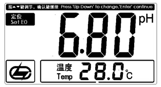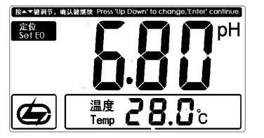 4.如果用戶使用的是其他非常規標準緩沖溶液,例如 6.80pH(如 28.0℃),按“定位”鍵,再按“PH/mV”鍵,然后需要按“▽”/“△”鍵”鍵調節顯示值使 pH 顯示為該溫度下標準溶液的 pH 值,如 6.80pH,然后按“確認”鍵,完成標定。如圖,(圖 11)