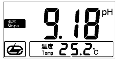 3.再次清洗電極并插入標準緩沖溶液 2 中(pH=9.18pH 的標準緩沖溶液中);用溫度計測出溶液的溫度值(如 25.2℃),并設置溫度值;稍后,儀器會顯示標準緩沖溶液的 pH 值,如圖,按“確認”鍵,儀器自動完成二點標定,否則按“斜率”鍵退出標定,儀器返回測量狀態。二點標定(斜率)狀態顯示示意圖(圖 13)