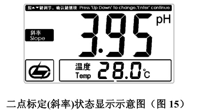4.如果用戶使用的是其他標準緩沖溶液,例如 6.80pH 和 3.95pH,用6.80pH 定位,3.95pH 標定電極斜率。則首先需要按“定位”鍵,再按“PH/mV”鍵,然后需要按“▽”/“△” 鍵”鍵調節顯示值,使 pH顯示為該溫度下標準溶液的 pH 值,如 6.80pH(如 28.0℃),然后按“斜率” 鍵,完成標定。如圖,(圖 14)