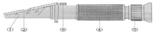折光棱鏡 ②、蓋板 ③、校準螺栓④、光學系統管路 ⑤、目鏡(視度調節環)