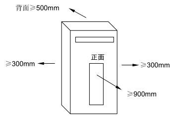 7) 設備距四周物件或墻壁間距:前≥900mm,左、右及頂≥300mm、后≥500mm(如圖所示)