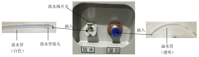 水管(白色)與放水管接頭連接,并將其插入放水口(聽到“咔”聲為卡到位),待水流出后再關閉放水閥(將放水閥開關按下,放水管及接頭彈出)。第一次開機使用時,為保證工作室內加濕水槽不因氣堵而順利自動進水,請將放水管(白色)與放水管接頭連接,并將其插入放水口(聽到“咔”聲為卡到位),待水流出后再關閉放水閥(將放水閥開關按下,放水管及接頭彈出)。溢出口處插入溢水管(透明),并放盛水盤或用水溝方式排水。