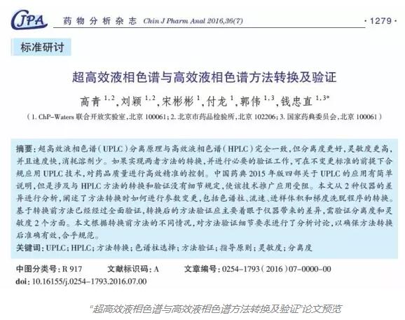 針對這一熱點問題,中國藥典-沃特世聯合實驗室撰寫了“超高效液相色譜與高效液相色譜方法轉換及驗證”文章,近期發表于《藥物分析雜志》(2016年第7期)。文中闡述了HPLC方法向UPLC方法如何進行轉換,以及轉換后需要進行哪些關鍵的驗證項目。