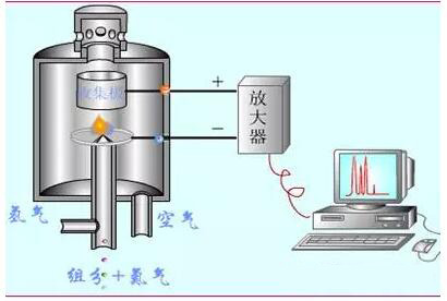 FID的電離室由金屬圓筒作外罩,底座中心有噴嘴;噴嘴附近有環狀金屬圈(極化極,又稱發射極),上端有一個金屬圓簡(收集極)。兩者間加90~300V的直流電壓,形成電離電場加速電離的離子。收集極捕集的離子硫經放大器的高組產生信號、放大后物送至數據采集系統;燃燒氣、輔助氣和色譜柱由底座引入;燃燒氣及水蒸氣由外罩上方小孔逸出。