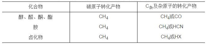 2、對非烴類化合物,其響應機理比較復雜,隨所含官能團的不同而異,基本規律是不與雜原子相連的碳原子均轉化成甲烷。雜原子及其相連的碳原子(C雜)的轉化產物見下表。