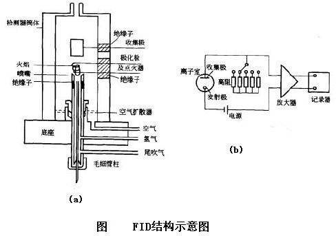 氫火焰離子化檢測器(FID)由電離室和放大電路組成,分別如下圖 (a),(b)所示。