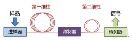 全二維氣相色譜(comprehensive two-dimensional GC, GC×GC)是在傳統(tǒng)的一維氣相色譜上發(fā)展起來(lái)的一種新的色譜分析技術(shù)。其主要原理是把分離機(jī)理不同而又互相獨(dú)立的兩支色譜柱以串聯(lián)方式連接,中間裝有一個(gè)調(diào)制器(modulator), 經(jīng)第一根柱子分離后的所有餾出物在調(diào)制器內(nèi)進(jìn)行濃縮聚集后以周期性的脈沖形式釋放到第二根柱子里進(jìn)行繼續(xù)分離,最后進(jìn)入色譜檢測(cè)器。這樣在第一維沒(méi)有完全分開(kāi)的組分(共餾出物)在第二維進(jìn)行進(jìn)一步分離,達(dá)到了正交分離的效果。