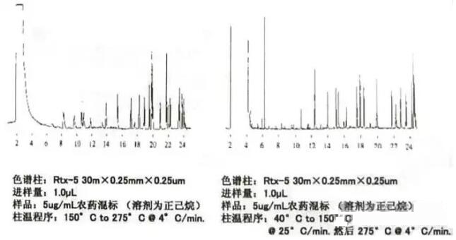 圖中可以看到,由于柱子液膜較薄,進樣寬度很大,峰形較差。當降低柱箱初始溫度形成溶劑聚焦后,峰高大大增加,峰形明顯好轉(zhuǎn),這是溶劑液膜層形成后對農(nóng)藥良好溶解的效果。