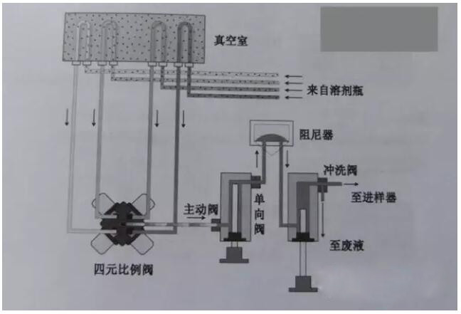 根據四元泵工作原理圖可以發現,流動相從溶劑瓶過來,先經過入口主動閥和出口單向閥,出沖洗閥(Purge閥)進色譜柱或者被排至廢液。