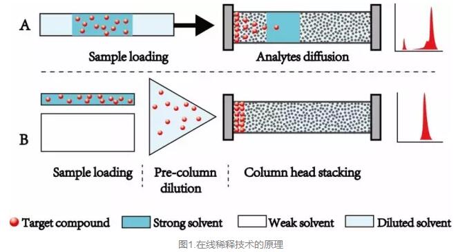 在線稀釋技術將強溶劑與高比例的弱溶劑通過高效混合器瞬間稀釋成一個90-95%的弱溶劑,再注入到色譜柱,因為弱溶劑無法推動目標物往前移動,此時目標物將在柱頭聚焦,待目標物全部聚焦在柱頭,再提高強溶劑比例,使分析物分離得到尖銳對稱的色譜峰。