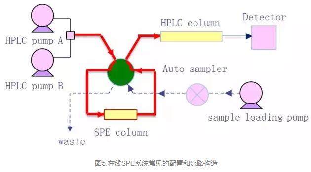 大體積進樣量有可能會帶來一個問題,即基質(zhì)雜質(zhì)增加,影響定量準確度。固相萃取SPE是一種有效的樣品富集和除雜手段,廣泛應用于食品、環(huán)境或生物樣品的前處理。但手工操作的離線SPE存在操作繁瑣復雜、耗時、重現(xiàn)性差等缺點,而在線SPE-HPLC可以部分解決以上問題。