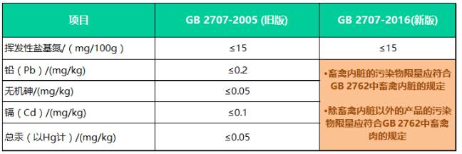 2、GB2707-2016中依舊保留了揮發(fā)性鹽基氮的限量指標(biāo),檢測方法為GB5009.228。而污染物限量、農(nóng)藥殘留限量和獸藥殘留限量分別參照國家標(biāo)準。